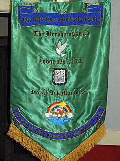The lodge was consecrated on 9th October 1958. The banner shows a dove, the coat of arms of the town of Berkhampstead and a rainbow over an Ark. The coat of arms shows the towns former castle and the surround of golden orbs indicates the castle once formed part of the Duchy of Cornwall.
